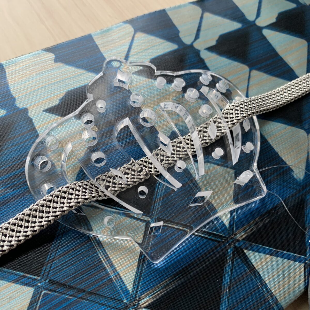 金具を使わず、紐通しの部分も本体のデザインと一体化させました。三分紐を通してお使いくださいませ。