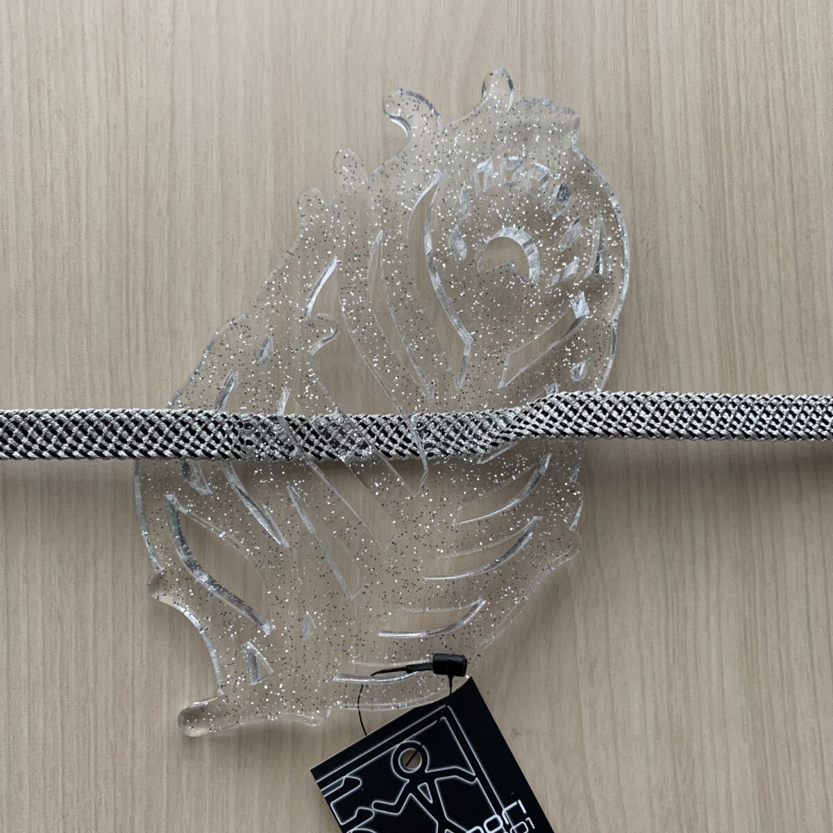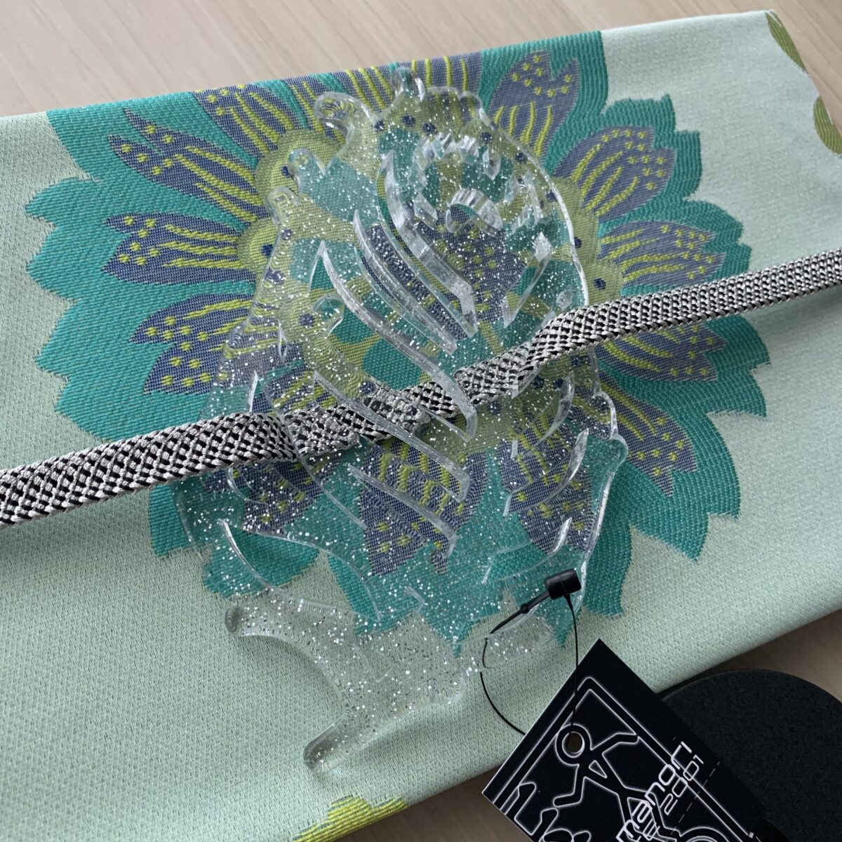 アクリル樹脂を孔雀の羽根の形にカットしたビッグサイズでインパクトのある帯飾りです。